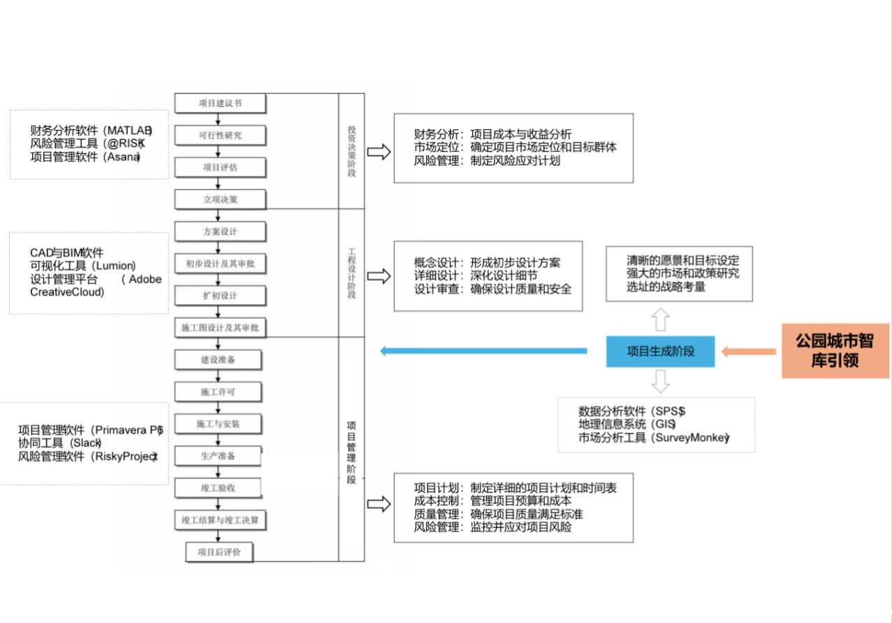 笔者所在的全咨服务单位是支撑成都市委、市政府建设践行新发展理念的公园城市示范区的智库单位。全咨服务单位在深入探索全咨模式的过程中,创新性地采取了以智库为引领的策略,特别是在项目谋划阶段,充分发挥了全咨服务单位作为“公园城市新型智库”的核心作用,立足成都建设践行新发展理念的公园城市示范区战略背景,聚焦公园城市建设发展机遇,在理论探索、理念更新、实践创新、场景营造等多个方面深入探索,构建了一套符合地方特色的全咨模式,将全过程工程咨询的服务周期进一步延伸为“项目生成—项目决策—施工准备(勘察设计—招标采购)—工程施工—竣工验收—运营维护”(如图1)。
